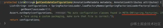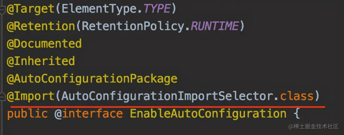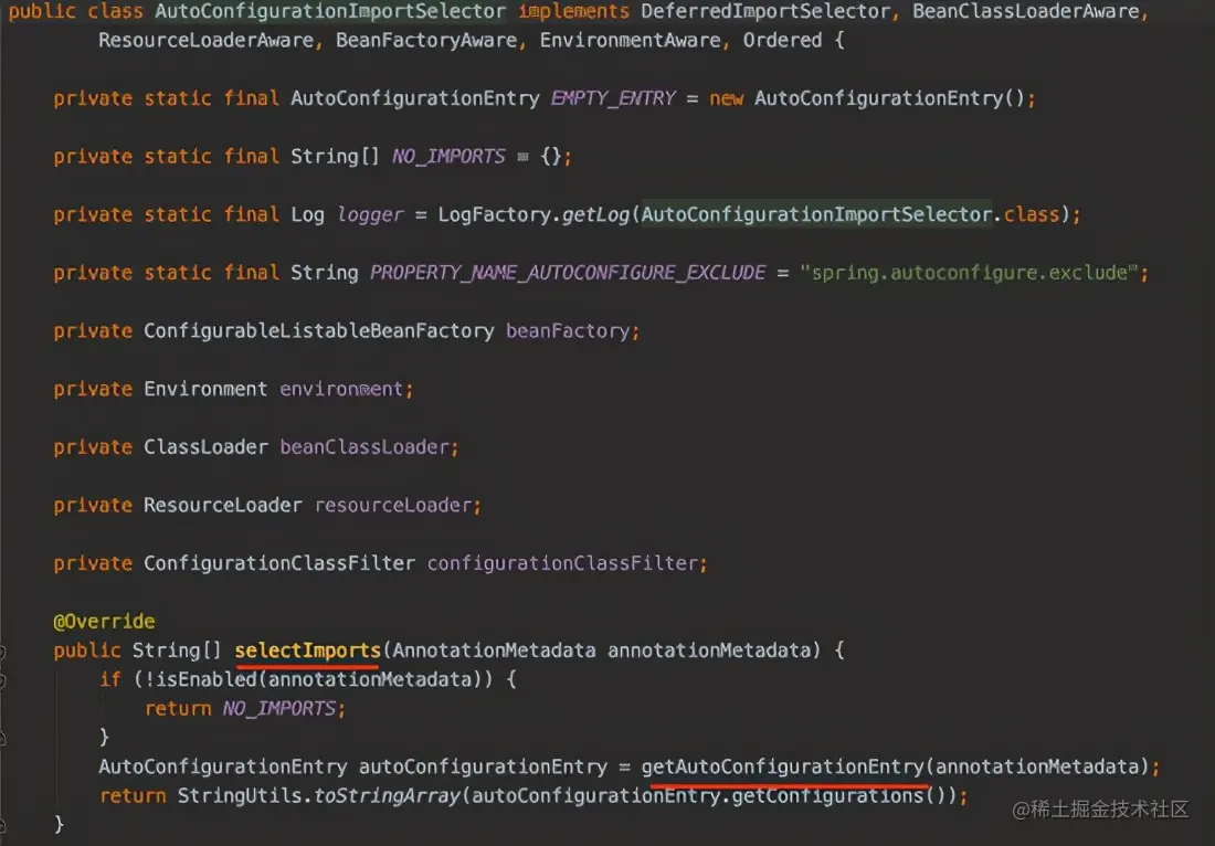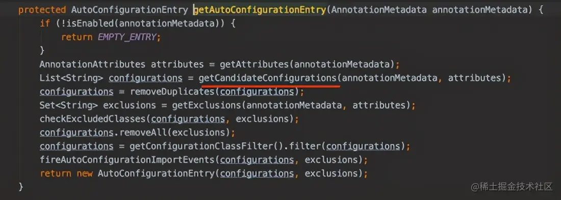 而 @EnableAutoConfiguration 注解使用了@Import来引入 AutoConfigurationImportSelector.class 选择器。 AutoConfigurationImportSelector.class 的源码,在 selectImports 方法中找到了 getAutoConfigurationEntry 方法的调用。