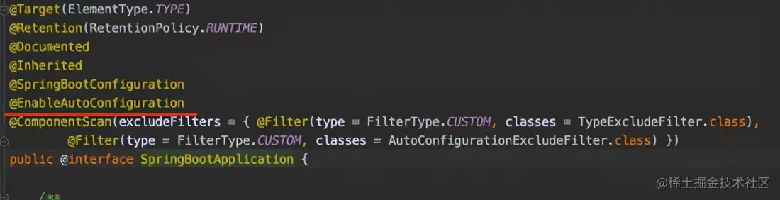 springboot框架的启动类都会加上 @SpringBootApplication 注解,而 @SpringBootApplication注解其实是 @EnableAutoConfiguration 注解和其他注解的组合。