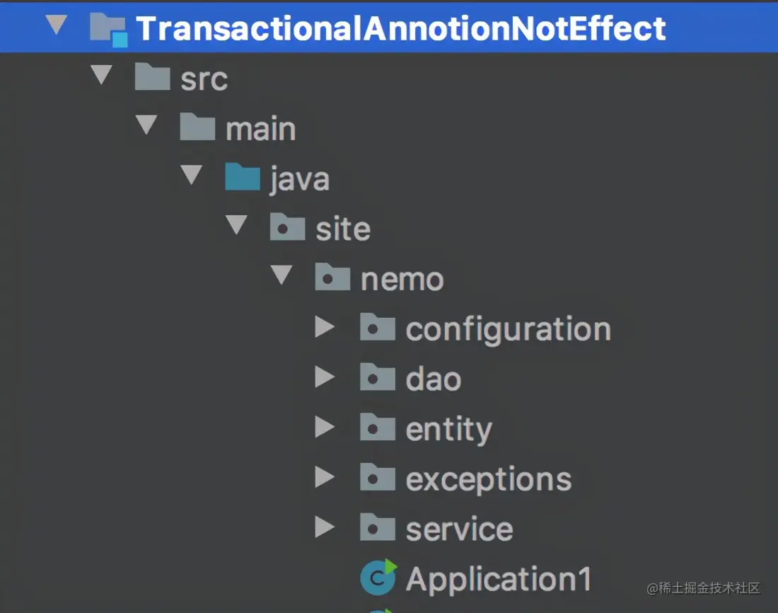 我们现在在 site.nemo 包下新建一个类 Application1 ,来调用 UserService 的 save1 方法