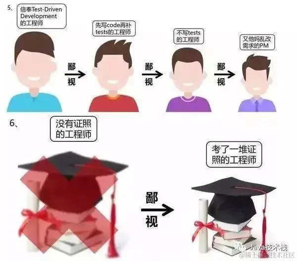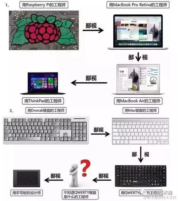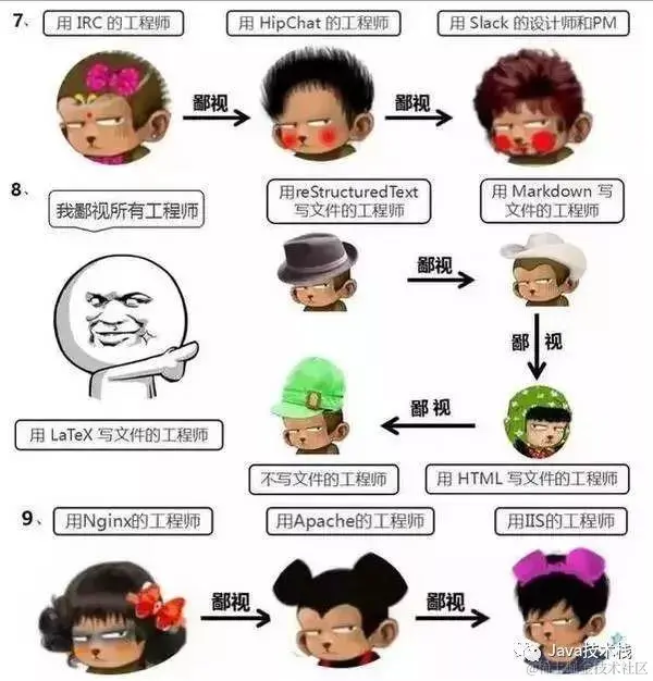 在实际工作中,表现的更为明显的是:运维屌开发,高级开发屌初级测试,高级测试屌初级开发,高级开发屌初级开发,初级开发……,都是能力不对称出现的各种鄙视链。
