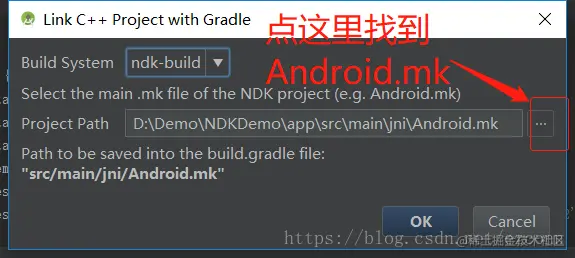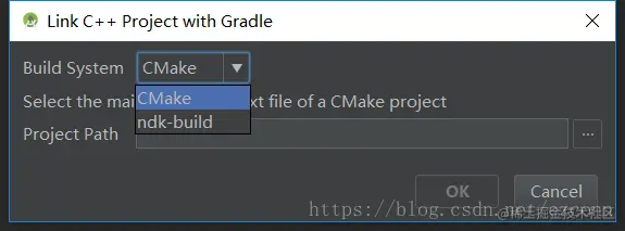 鼠标右键项目,点击 Link C++ Project with Gradle 修改 Androidstudio 默认编译工具, 在 BuildSystem 栏选择 ndk—build, 在 ProjectPath 选项栏,找到刚才创建的 Android.mk 文件(其实就是 Android.mk 文件路径),点击 OK 之后就在 build.gradle(Model:App)的 android{} 中自动生成了 externalNativeBuild { ndkBuild { path 'src/main/jni/Android.mk'} }