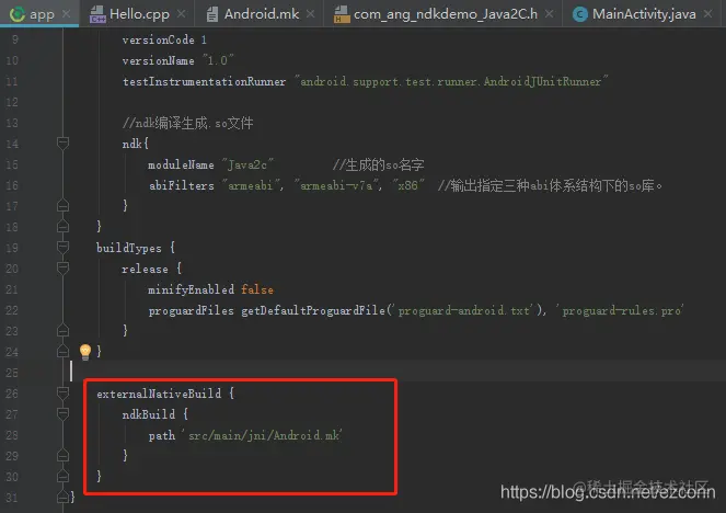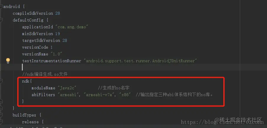 也可以不配置 ndk{}, 这里只是指定编译出哪几种对应的 abi 架构的. so 库,如果不配置,会根据 ndk-build 默认输出对应的 abi 架构的. so 库;最好配置,不然不能编译出自己想要的对应 ABI 架构的. so,如果自己的项目中已经引用其他的. so 库还要做适配;