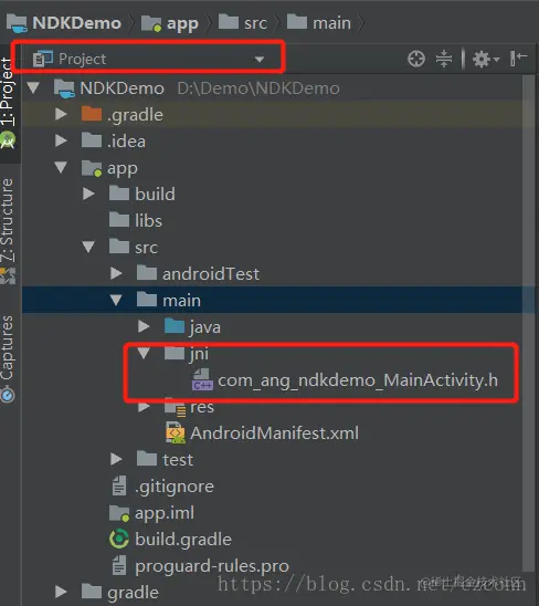 2,执行以上命令之后:就在项目的 main 文件夹下创建了 jni 文件夹,并且在 jni 文件夹下自动创建了. h 头文件;头文件名也是自动生成的,命名规则是 com_ang_ndkdemo_MainActivity.h(包名 + 类名. h)