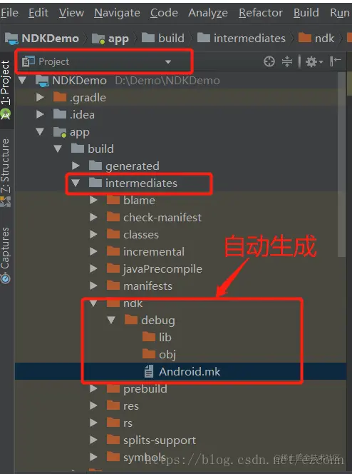 b, 在 app ——> build ——>intermediater——>ndk(自动创建) 目录下自动创建了一个 Android.mk 文件