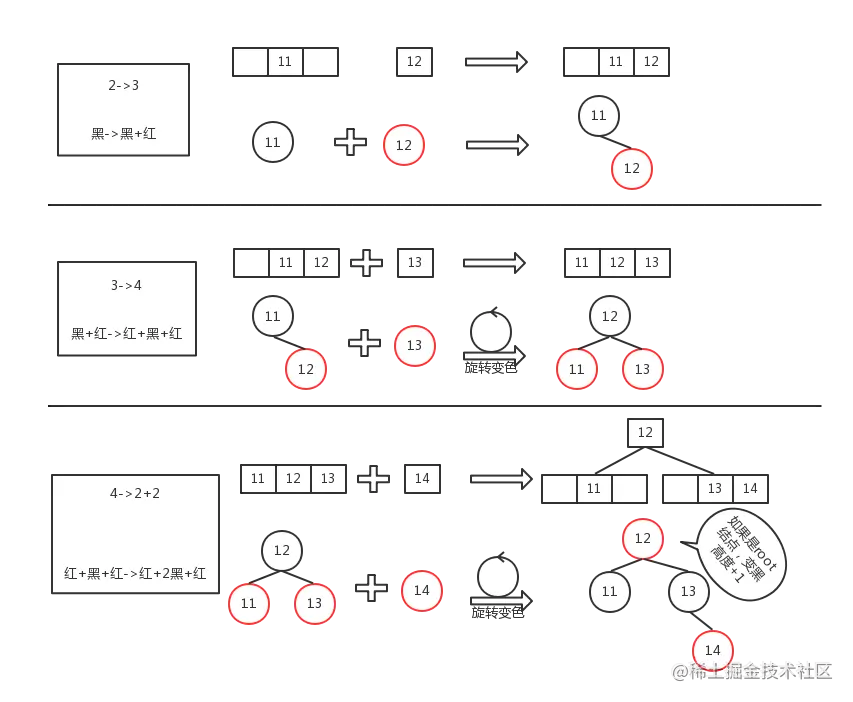 由红黑树的性质5,和 2-3-4树的性质1,为了便于理解红黑树和 2-3-4树的对应关系,我们可以把红黑树从根结点到叶子结点的黑色结点个数定义为高度。