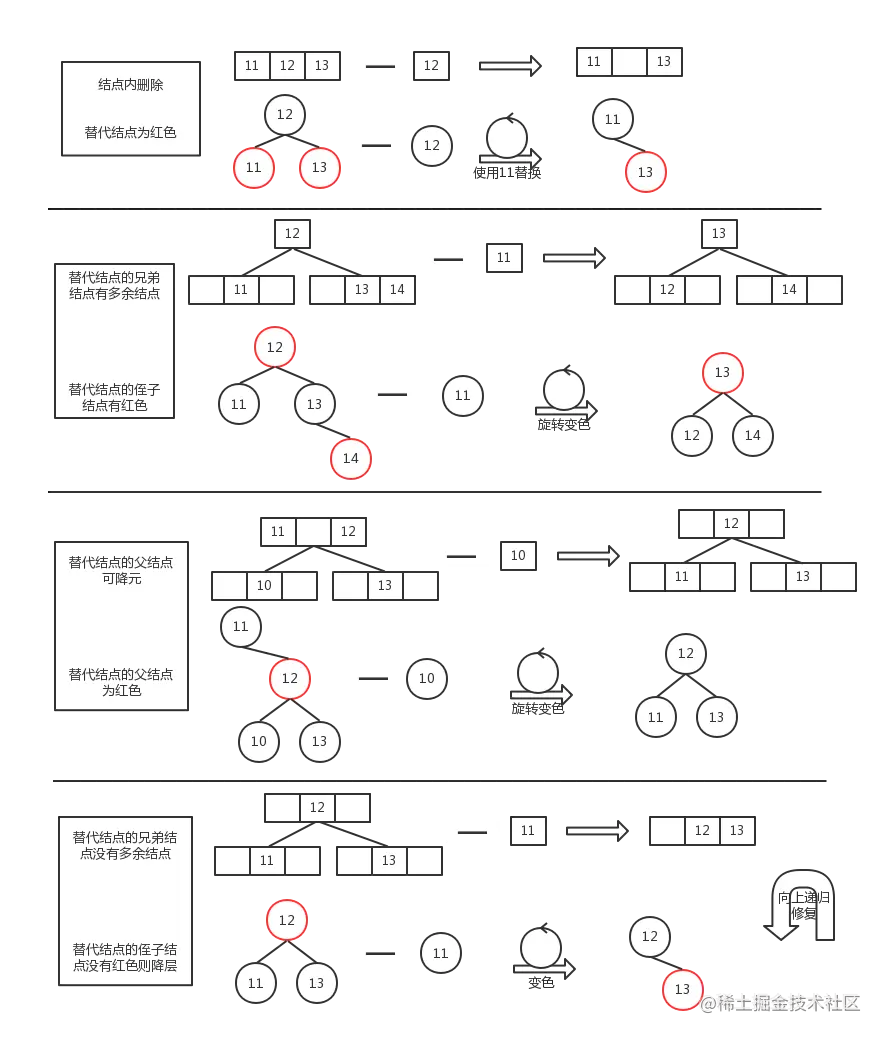 兄弟结点的子结点中有红色结点(兄弟结点对应 3-结点或 4-结点)能够“借用”,旋转过来后修正颜色;