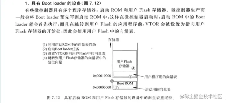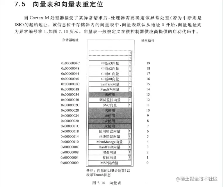 单片机上电后,程序首先跳转到地址0处,此时主堆栈指针MSP的初值也为0。然后单片机产生了复位信号,主堆栈指针加1,由于单片机内核为32位,所以地址增加一位,实际上是增加了32位,也就是增加了4个字节。此时MSP指针就指向了复位向量。而Cortex-M内核处理器的向量表可以重新定位,所以此时程序就会跳转到复位向量重新映射的地址处。