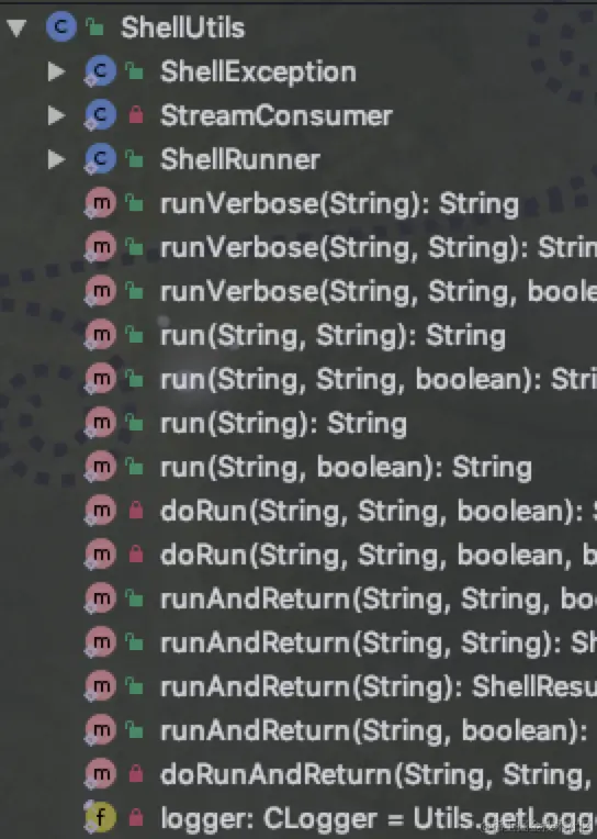 接下来,我们来看一段ZStack里的工具类ShellUtils,为了节省篇幅,我们仅仅截出它在IDE里的Structure:
