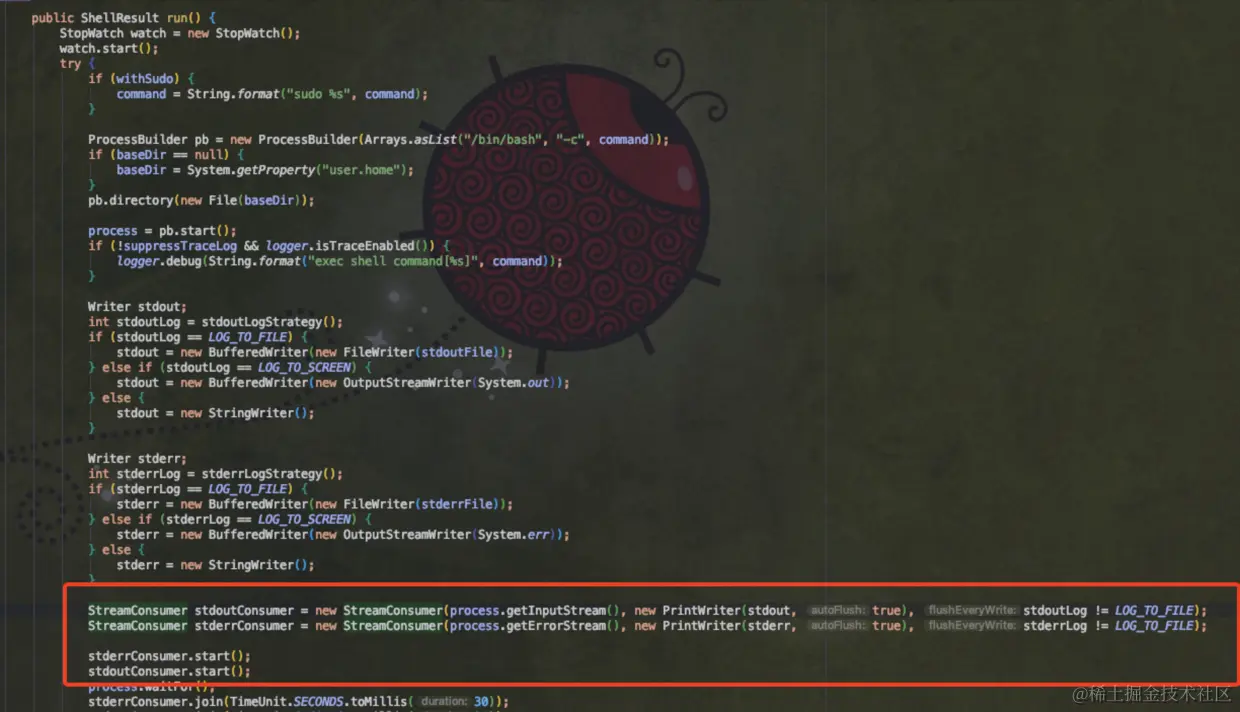 简单解释一下这段代码——即通过ssh到一台机器上,然后执行一些命令.对命令输出的东西,开了一个循环,每一次读一定的位置,然后以字节流的形式读回来.