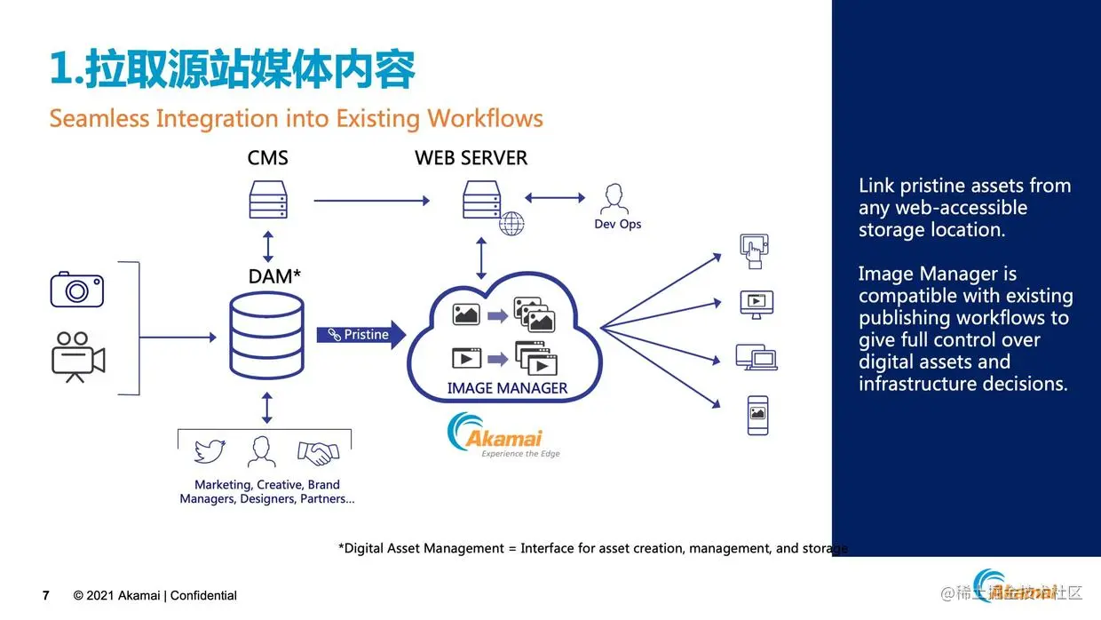 首先我们看第一步,通常来说所有的媒体资源都是放在内容管理的平台CMS或是DAM,所有的用户访问图片时,它会是先经过Akamai的CDN和IVM的平台,IVM只需要回源拉取一份高清的图片,接下来的工作就都在CDN平台去完成的。