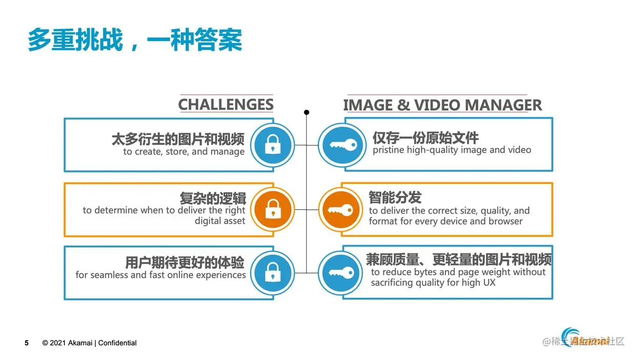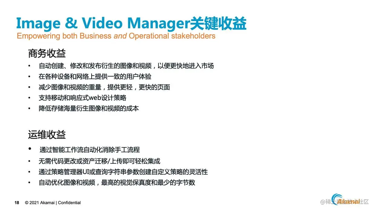 最后简单的总结下,Akamai的IVM给我们带来的一些关键收益。第一只需要在源站存储一份高清的原始文件,对文件的转换在CDN进行,降低了在源站创建、存储和管理文件多个副本的复杂度和成本。第二对CDN创建的各个文件副本,CDN会智能地根据终端的设备,浏览器的类型,屏幕大小做自适应的分发,避免在源站实现复杂的分发逻辑。第三所有的转换都是以图片和视频的质量为保证前提的,转换后的视频图片会变得更小,用户打开更快,体验会更好。