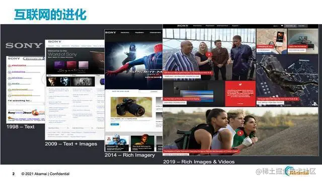 互联网是在持续进化中,最终服务于用户,而用户对体验的追求是在持续提升的,随着网络基础设施的逐步延伸和各种智能终端的普及,大家都希望可以看到更高清、更丰富的图片和视频,所谓一图胜千言,纯粹的文字对很多用户来说已经没有吸引力了。上图是来自索尼官网的展示,它记录了从1998年到2019年整个官网变化的过程,我相信这也是互联网持续进化的一个缩影。我们可以看到在1998年时,整个网站主要以文字为主,在2009年多了一些图片,到了2014年,图片的大小、数量和色彩度都是有增加的,到2019年时,整个网站除了图片还增加了视频内容,这大大提升了访问网站的用户体验。