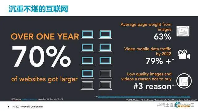 更多的图片和视频内容,当然能够吸引很多用户,但是另一方面,也导致了整个互联网的站点变得更加沉重。通过Akamai对Alexa Top10000的站点分析,近一年平均网站的大小增长在70%以上,这很大程度上都是因为图片和视频等富媒体内容的增长而导致的。通过一些第三方的报告,我们可以看到,平均页面图片的占比已经达到了63%,并且我们也预计在2022年移动端的视频流量将会占到整个移动流量的79%以上。