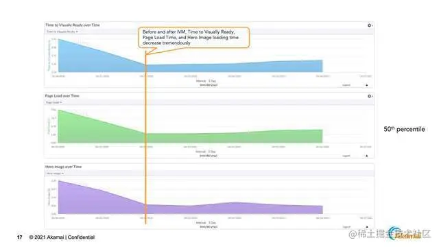 前面是单个用户的情况,通过Akamai RUM工具mPulse可以看到整体用户使用的效果。对比优化前和优化后,从Page load time来说,在4.21使用IVM之前,整个页面的加载时间是7-8s,但是在优化之后,平均Page load time变成了2-4s,这其实是个非常明显的效果。同样在其他维度,TTVR和它的Hero Image的图片,都有类似优化的效果。
