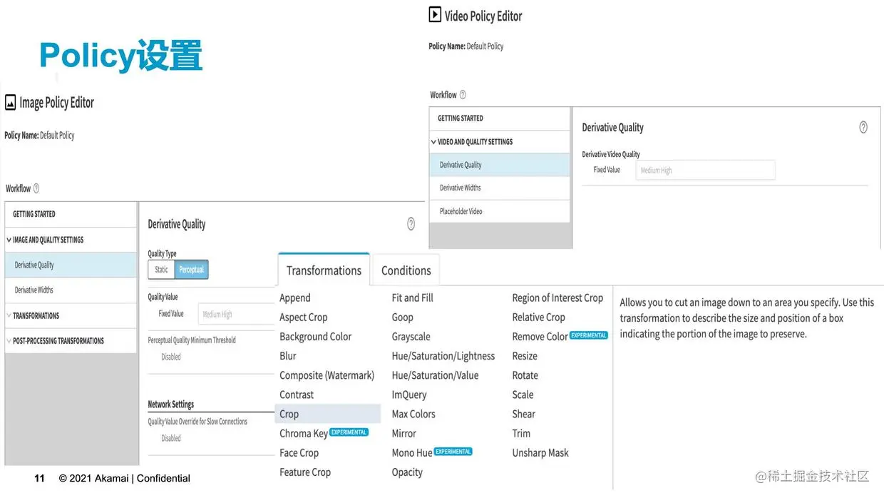 接下来我们可以看一下在后台设置Policy的界面。上面分别是Image Policy Editor和Video Policy Editor的配置界面。整个过程非常的简单,如果是图片,可以设置转换后图片的质量和宽度,如果需要对图片进行艺术转换,可以设置转换的策略。转换的策略有非常多的类型,前面也有提到,比如说加水印、裁剪、翻转、图片镜像等,这些功能一应俱全。对视频来说只需要设置好转化后的视频质量和视频宽度就可以了。