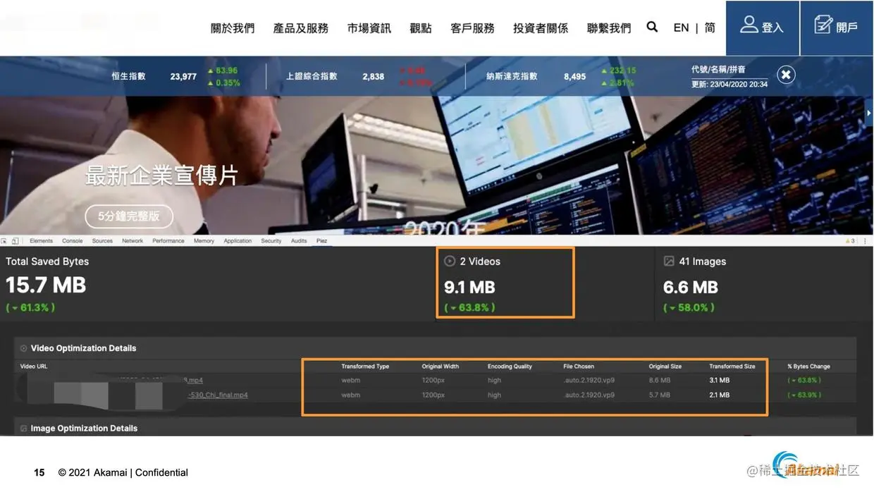他们使用Akamai图片和视频解决方案之后,帮助他们解决了之前用户体验的问题,效果非常明显。Akamai提供了不同的工具来看到这个效果。首先是客户端上面的,有个叫PIEZ的插件,装上这个插件后,用户可以看到在图片视频优化的效果。上面两个框是视频优化后节省的整个文件的大小和具体转换使用的一些策略,可以看到两个视频帮助共节省了9.1MB差不多63.8%的大小,图片节省了58%左右的大小,小了6.6MB,最终用户打开官网的速度更快了。下面那个框可以看到转化策略的一些参数,比如源站是两个MP4的文件,经过转换我们把它变成了webm的格式,有一列File Chosen代表这个URL转换使用的策略,这里用到了更高效的VP9视频压缩算法,这也是为什么整个视频大小能过大大降低的原因。