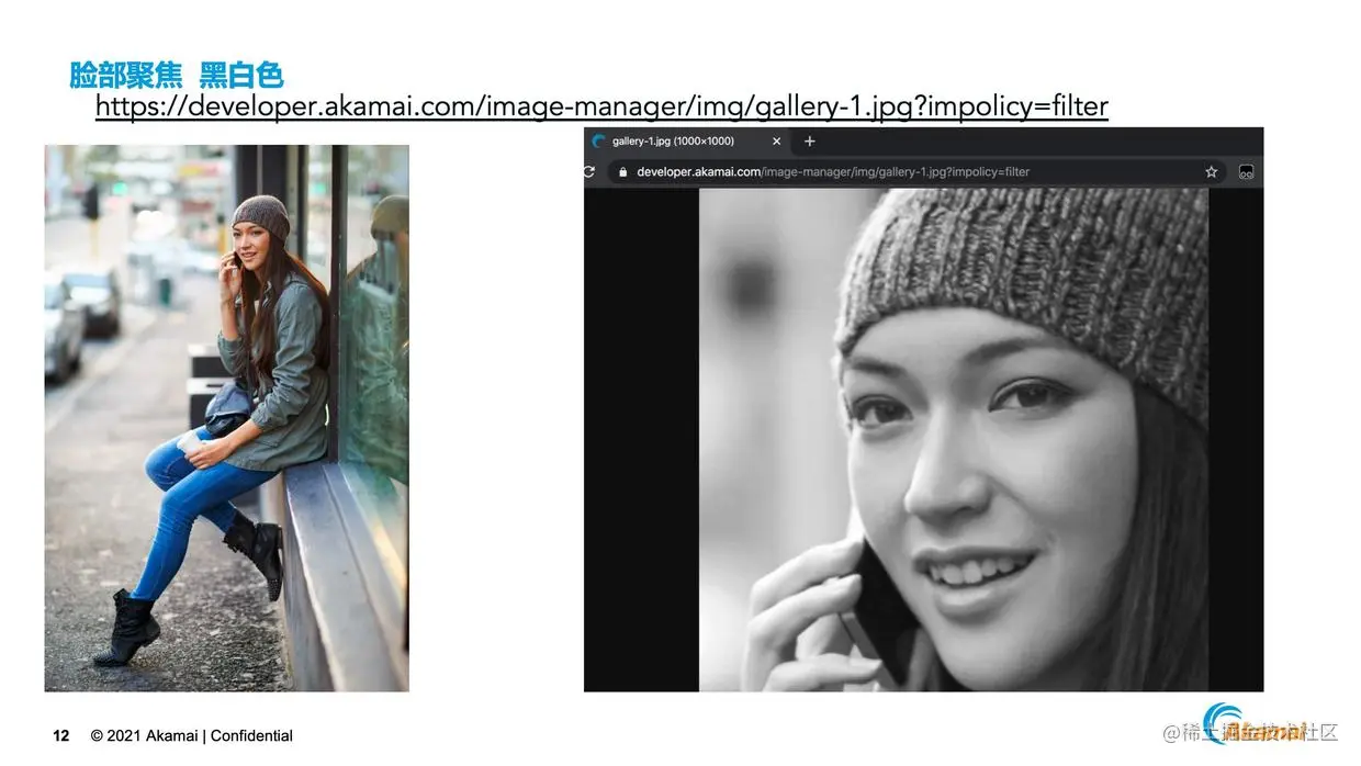 设置好策略之后,再去调用这些图片是非常简单的,只需要在图片后带上对应的策略名称。这里举一个例子,我们想针对左边的图片对脸部进行聚焦之后变成黑白色,我们只需要调用上面的连接,然后带上Policy的名称,对应的图片也就生成了,是不是非常的简单方便?