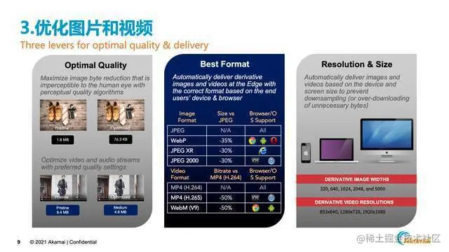 第三步就是怎么样去优化图片和视频,这一步简单而言就是一句话,让图片和视频变得更小。对于图片而言,我们可以采用Akamai基于视觉质量的专利压缩算法,在相同的图片格式下,能够让图片压缩变得更小。对于视频来说,我们可以把一些高码率的视频转化成低码率,这样文件的大小也会变得更小。