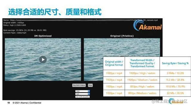 接下来我们也分享更多的细节,非常重要的一点是平衡尺寸、质量和文件大小的关系。Akamai后台有工具可以帮助我们在设定策略时,选择合适的尺寸、质量和格式。比如一个1920px宽度的mp4视频文件,通过工具我们可以看到选择转换成不同的尺寸、质量和格式时文件大小的节省是不一样的。如果保持1920px的宽度,选择转换成high的质量和webm的格式,相比原始文件可以节省10.2%的大小。同样保持1920px的像素宽度,我们把它转成medium质量的话,可以节省32.8%的大小。对于一些小屏幕的终端设备,可以把它转成 853px的像素,同时保持high的视频质量,这时大小可以节省70.9%。通过这样的工具,可以提前看到使用之后的效果,平衡尺寸、质量以及文件大小的关系。