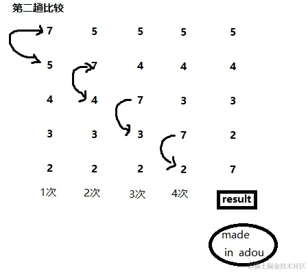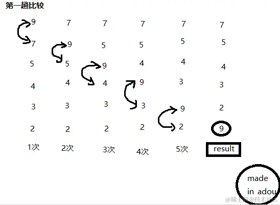 第一趟的比较,最大数9 已经到了最下面,第二趟的比较就是把第二大的数7挤到最下面,如图,7下来了。这次比较的是4次。。。好了,我们来推算一下