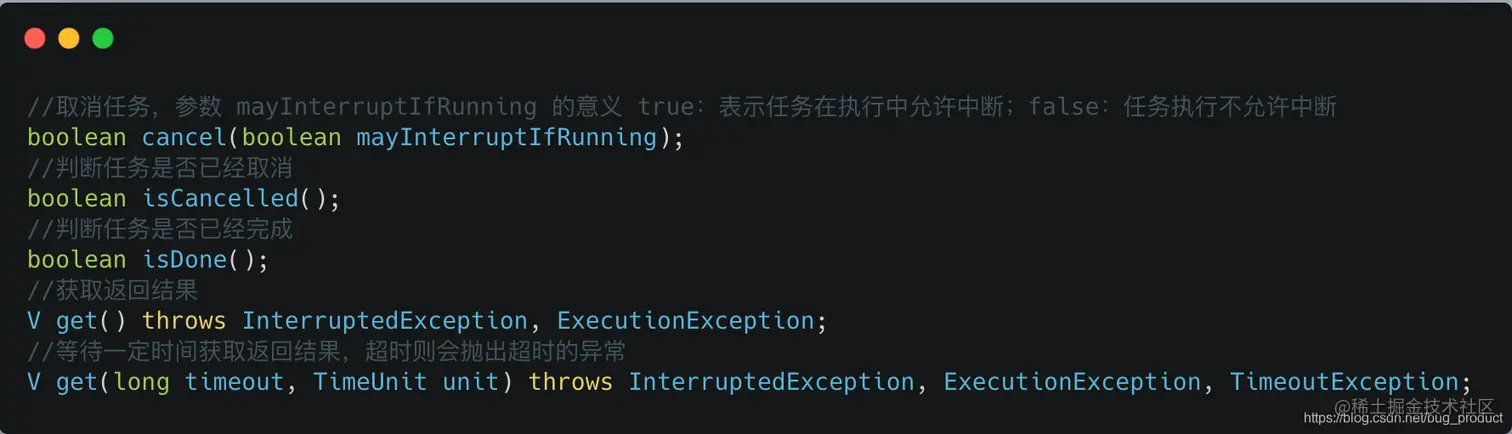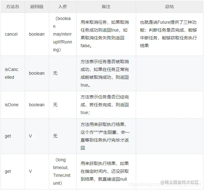java.util.concurrent.Future对象为我们解决了这个问题。在线程池提交Callable任务后返回了一个Future对象,使用它可以知道Callable任务的状态和得到Callable返回的执行结果。Future提供了get()方法让我们可以等待Callable结束并获取它的执行结果。