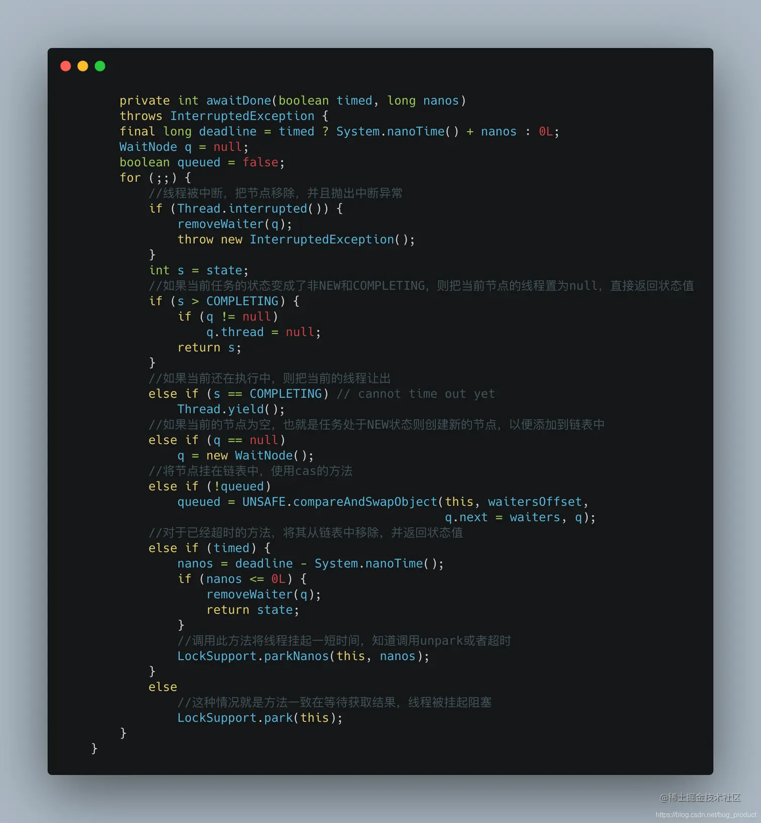 但这里如果返回true,并不代表这个任务是成功执行的,比如说任务执行到一半抛出了异常。那么在这种情况下,对于这个isDone方法而言,它其实也是会返回true的,因为对它来说,虽然有异常发生了,。但是这个任务在未来也不会再被执行,它确实已经执行完毕了。