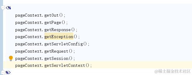 9 pageContext:最后一个内置对象,最后一个域对象.这个域对象的作用范围是在当前页面.啥是当前页面,就是在A页面设置一个setAttribute("key","value");在B页面getAttribute("key");你取不到,只能在他自己页面用,看起来并没有什么卵用.但是,存在即合理.这个域对象的作用远远不止这些.首先他可以获取其他8个内置对象.