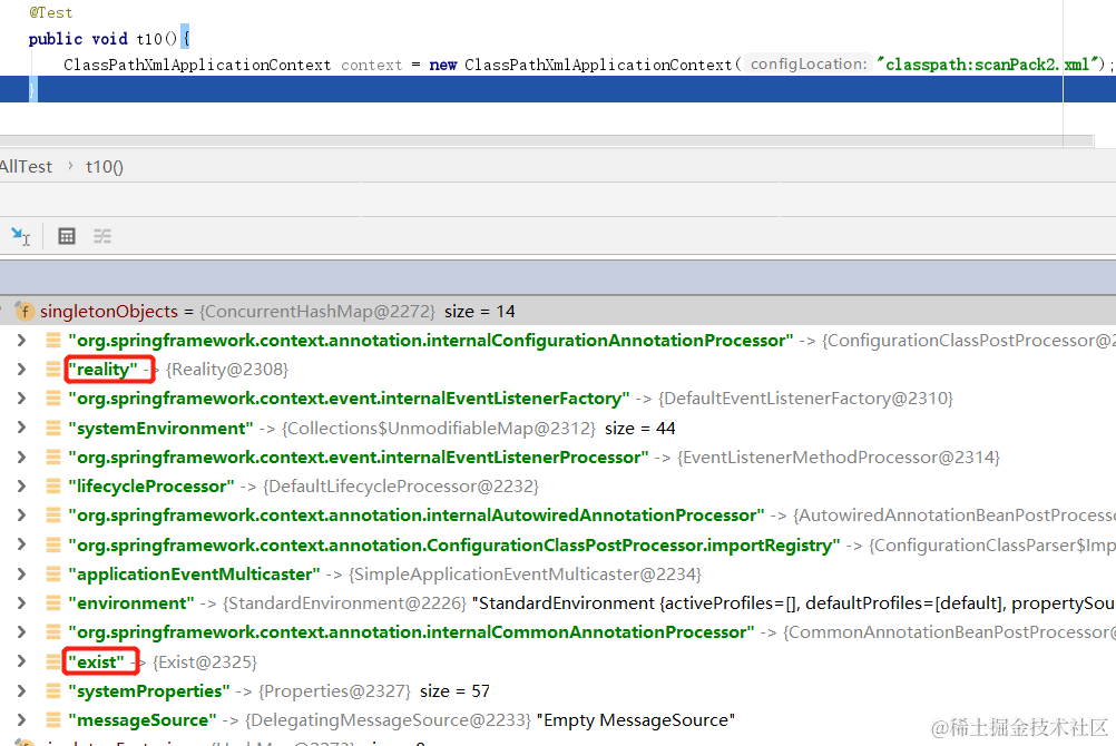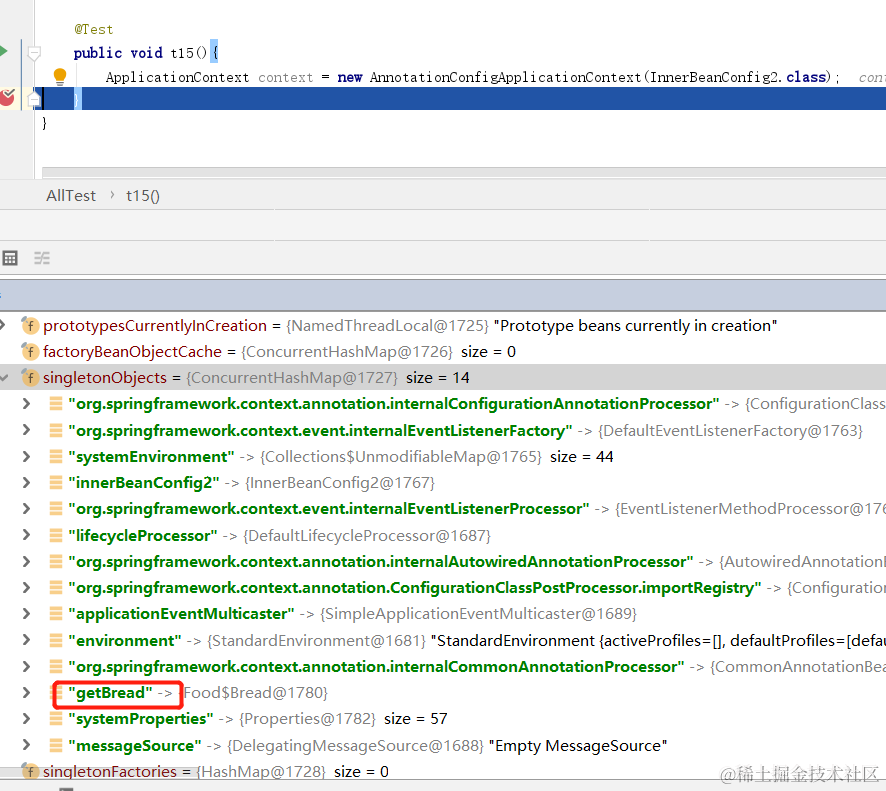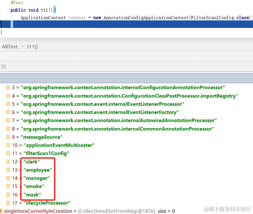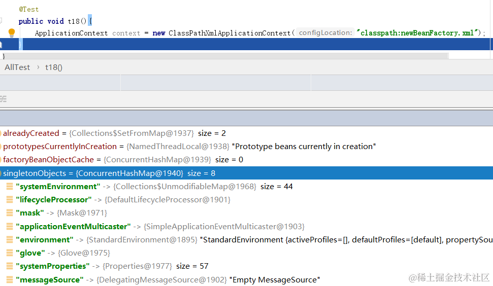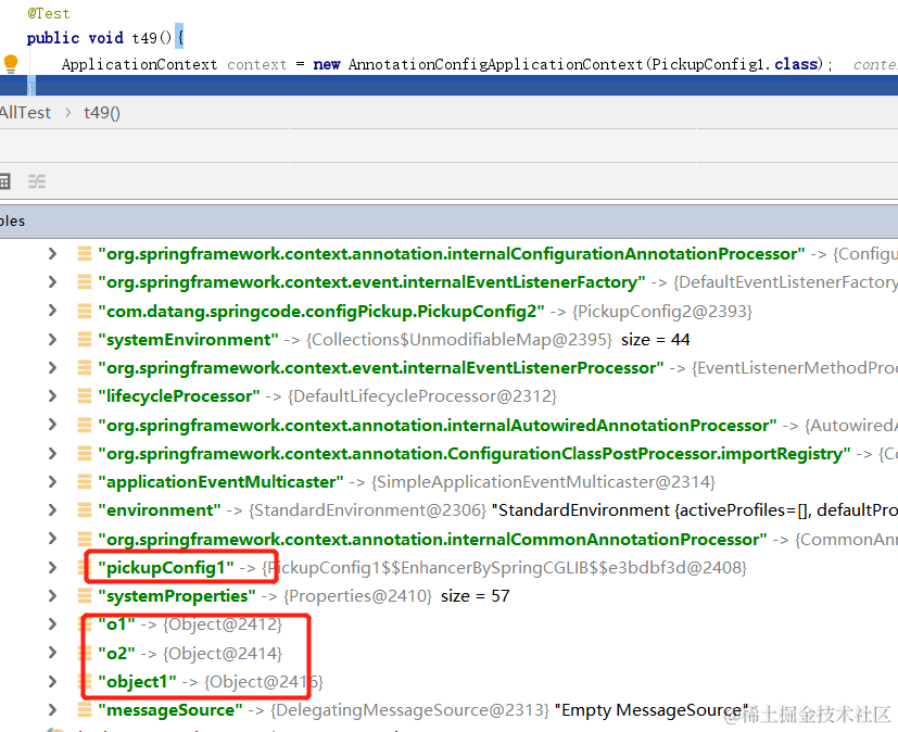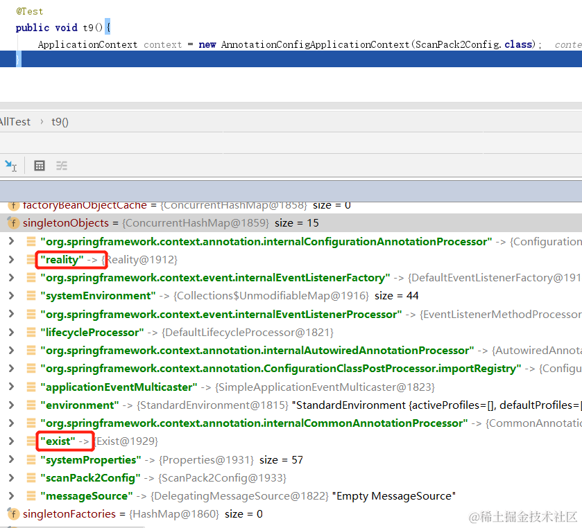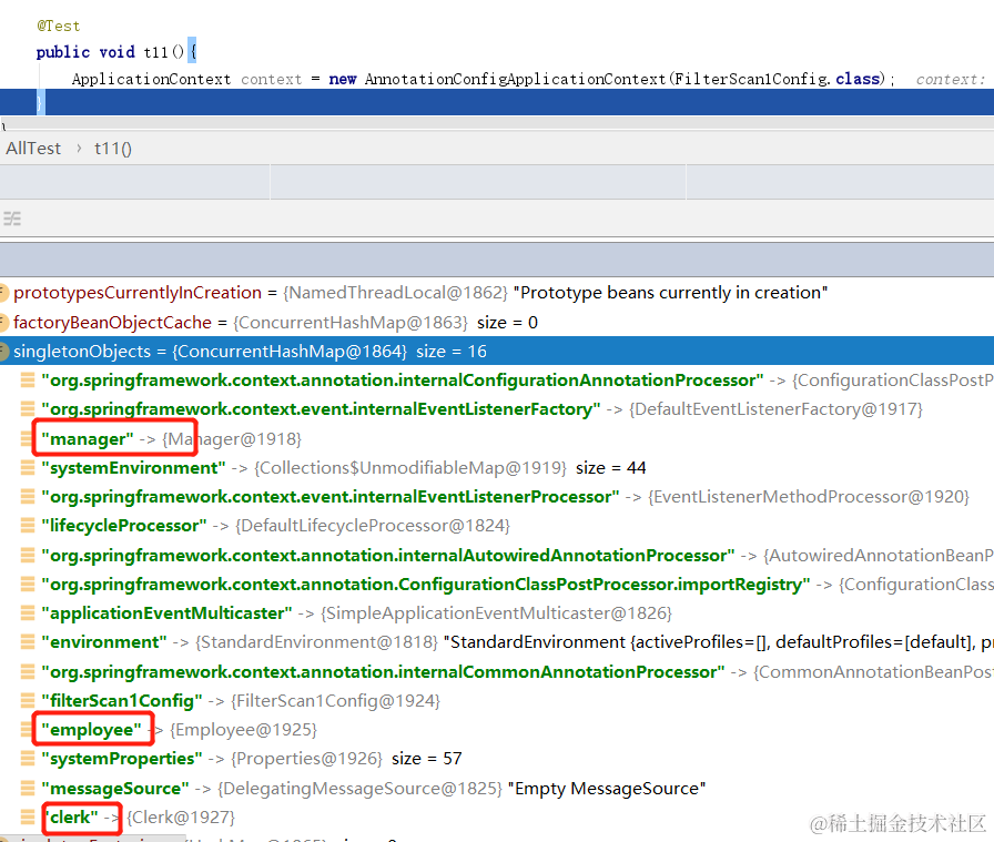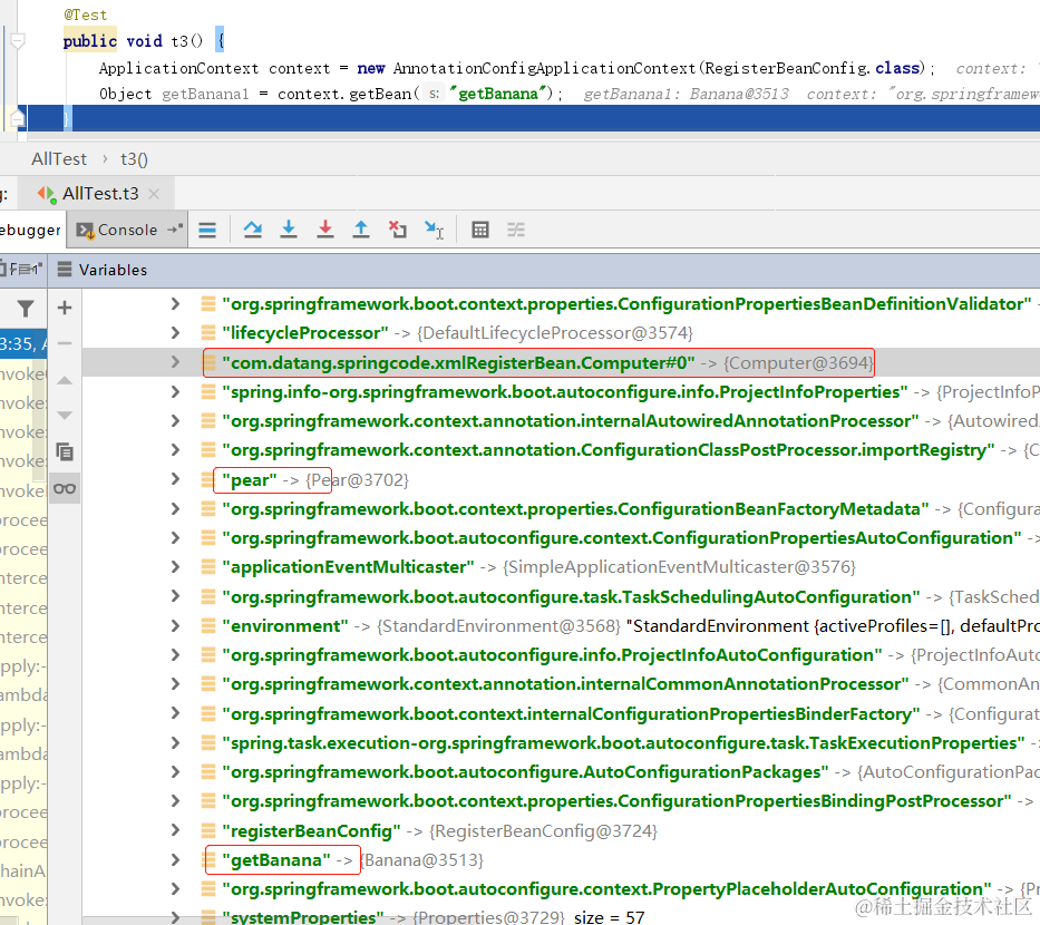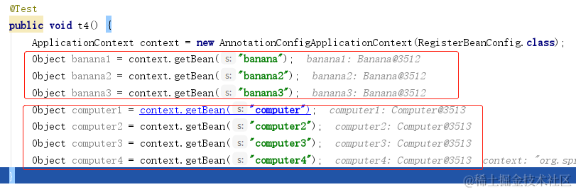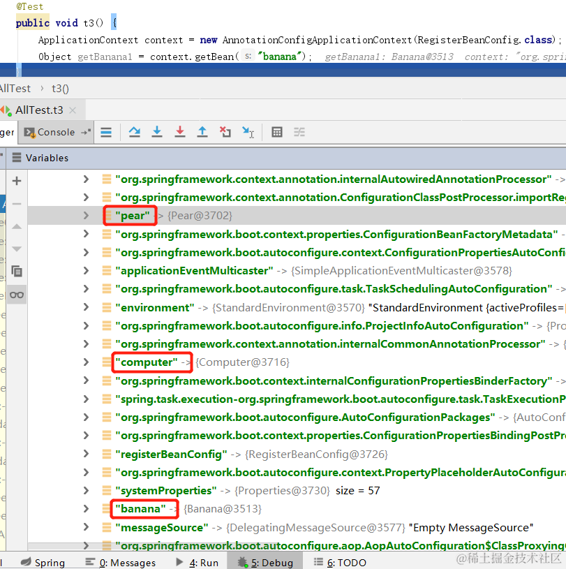 在上边代码中,使用@ComponentScan和@ImportResource注解分别扫描包中的注解和加载xml,为的就是我们能在一个Map中看到三个bean。xml方式实例化bean默认的id是类的全路径拼接#和编号。而@Component注解方式则是使用类名,首字母换成了小写。使用@Bean方式实例化bean时,bean的名称是@Bean所注释的方法名。