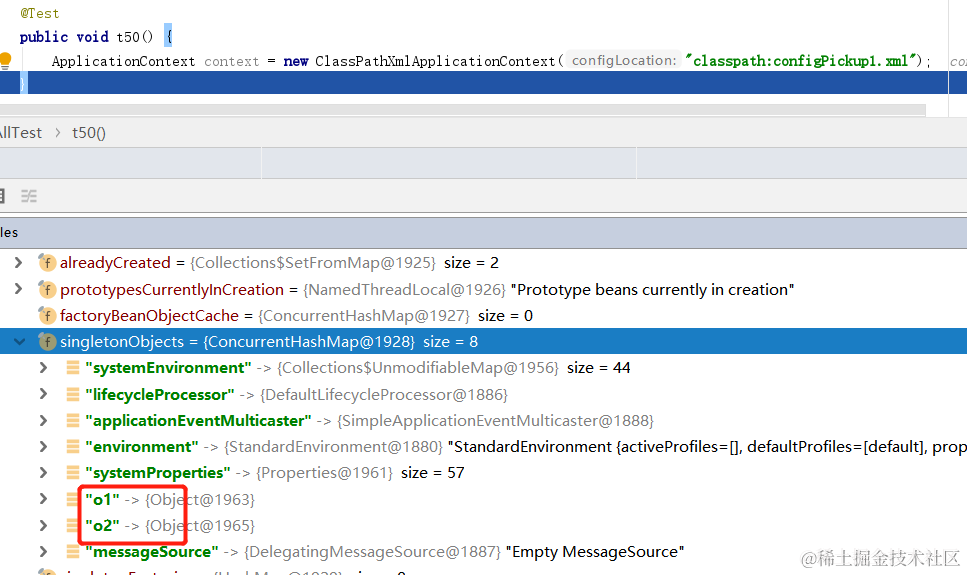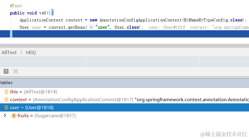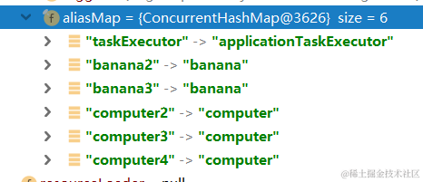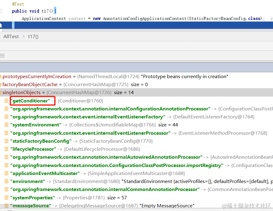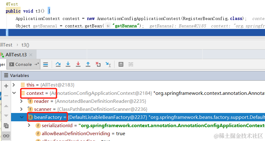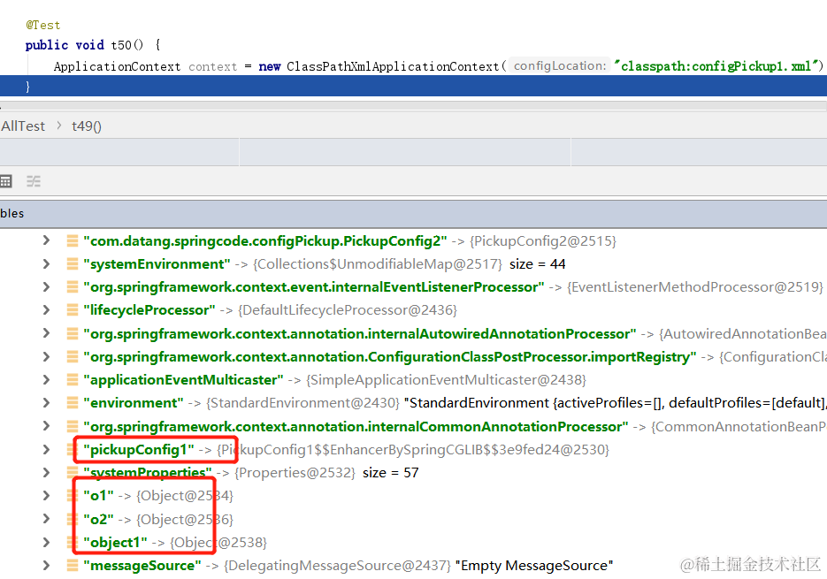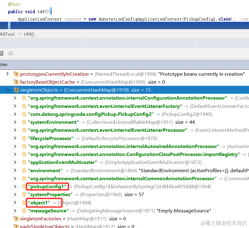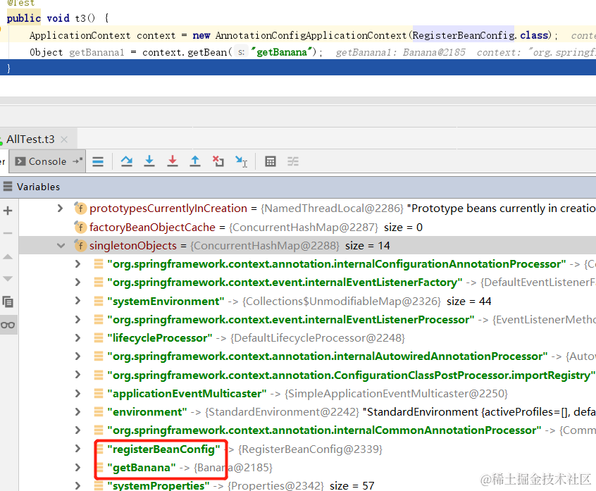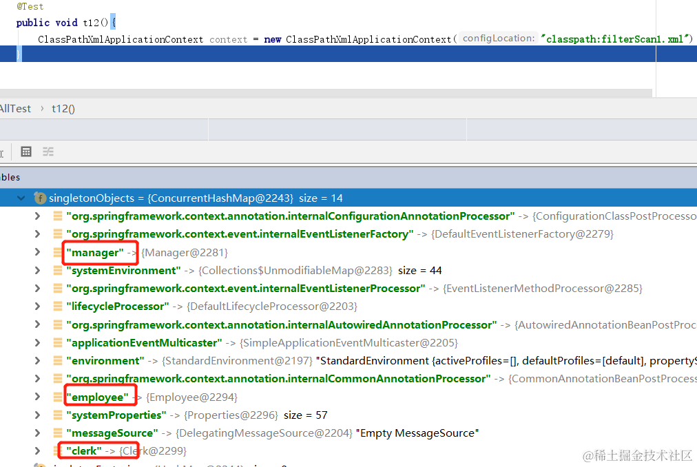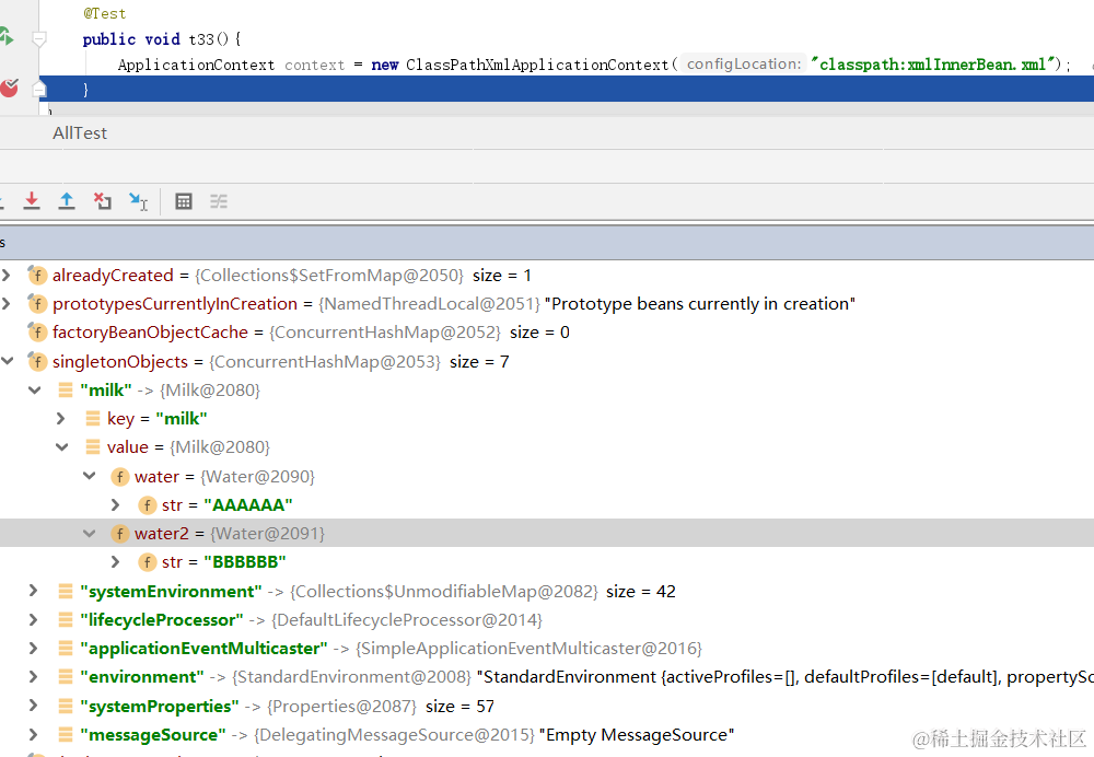 在上边代码中,使用@ComponentScan和@ImportResource注解分别扫描包中的注解和加载xml,为的就是我们能在一个Map中看到三个bean。xml方式实例化bean默认的id是类的全路径拼接#和编号。而@Component注解方式则是使用类名,首字母换成了小写。使用@Bean方式实例化bean时,bean的名称是@Bean所注释的方法名。
