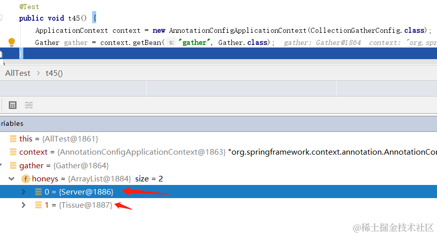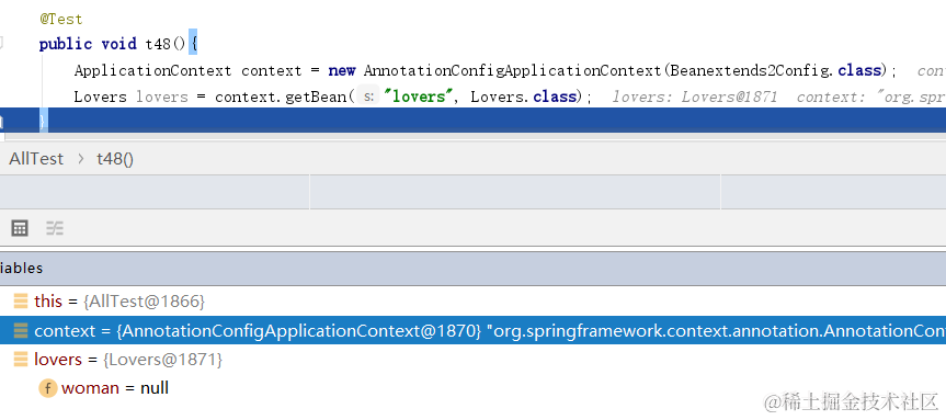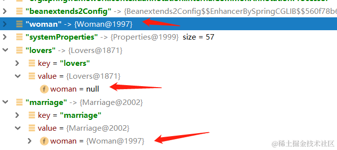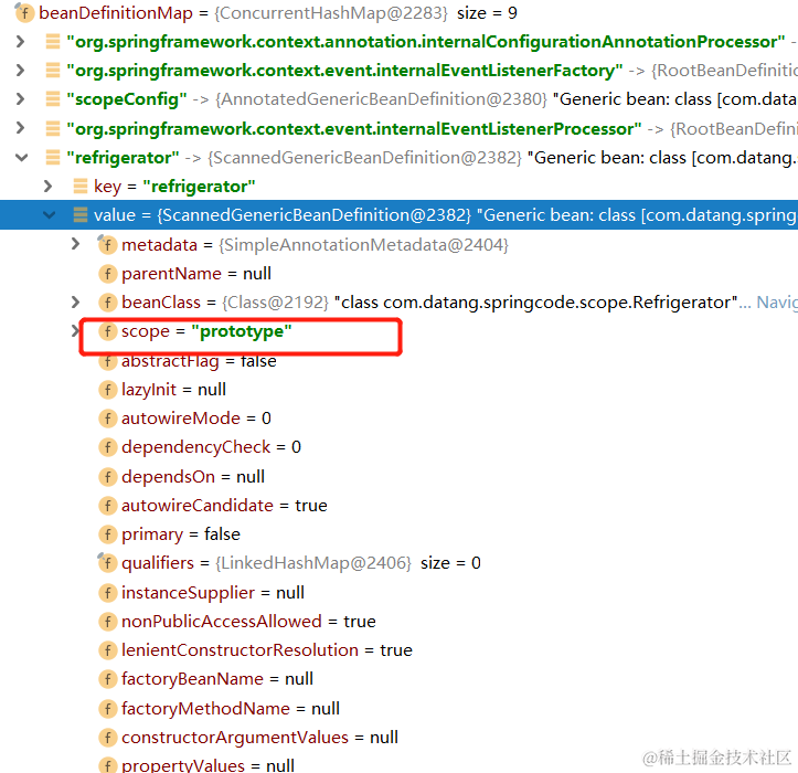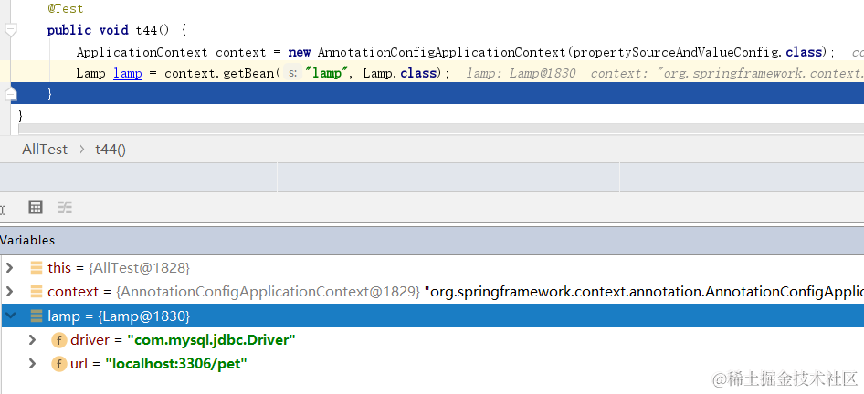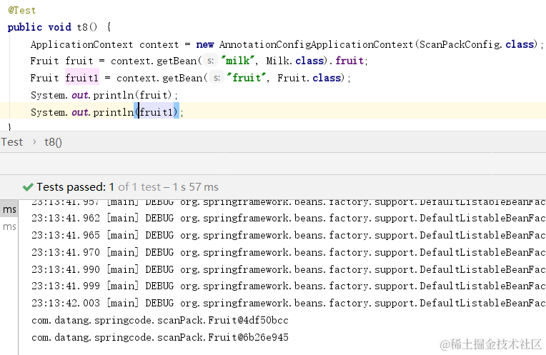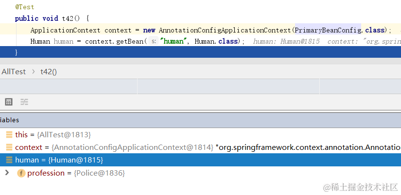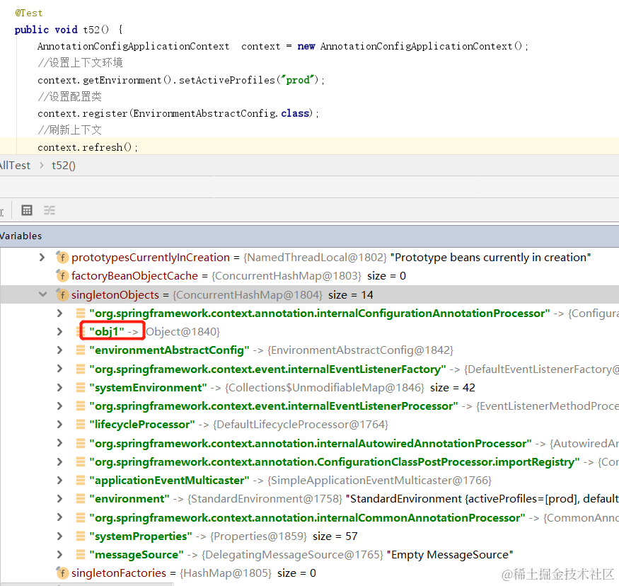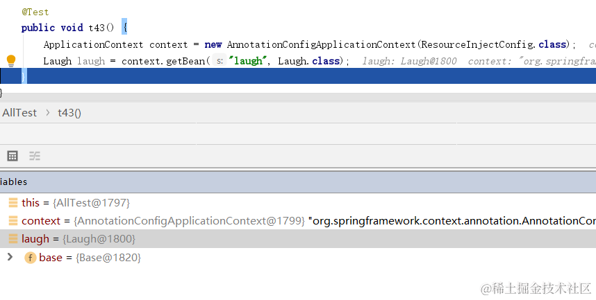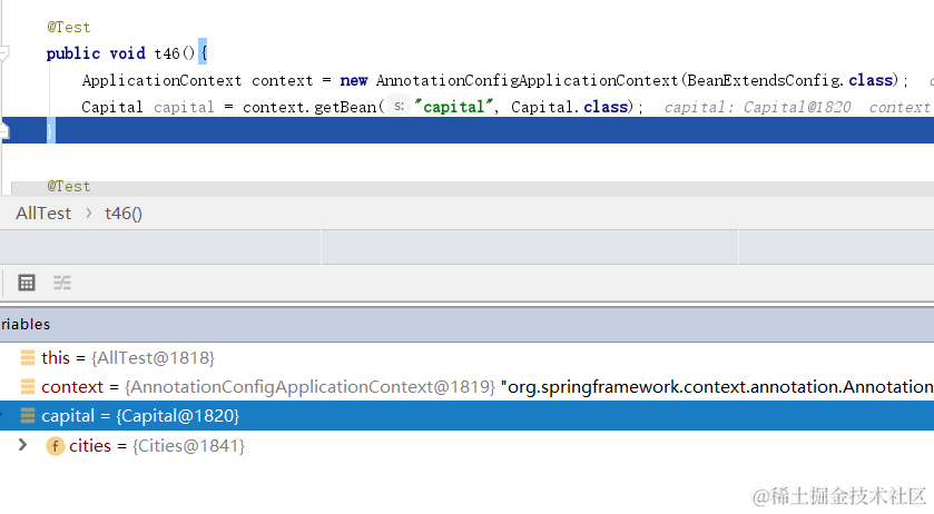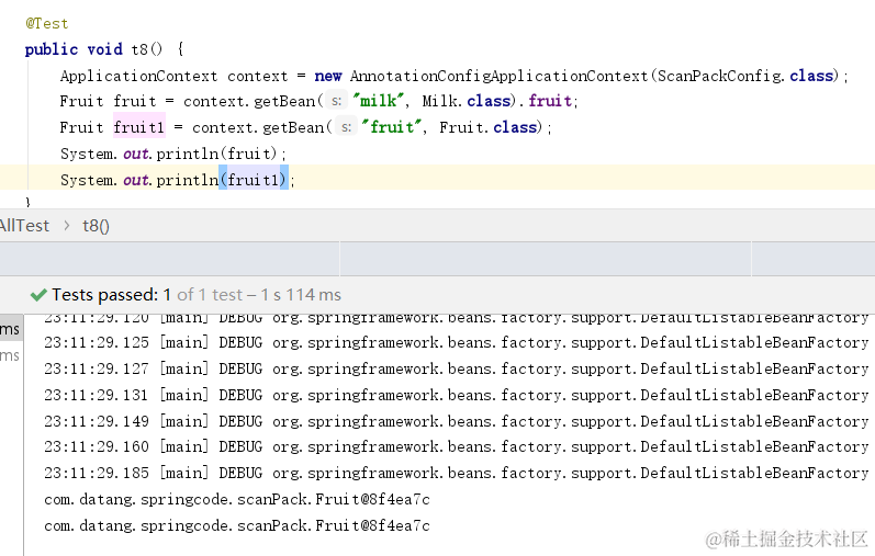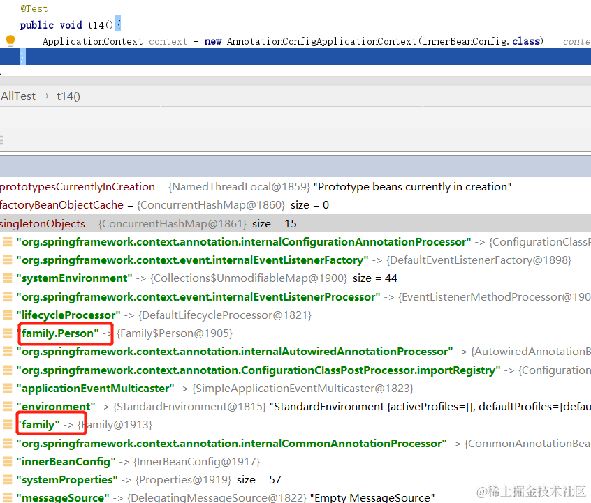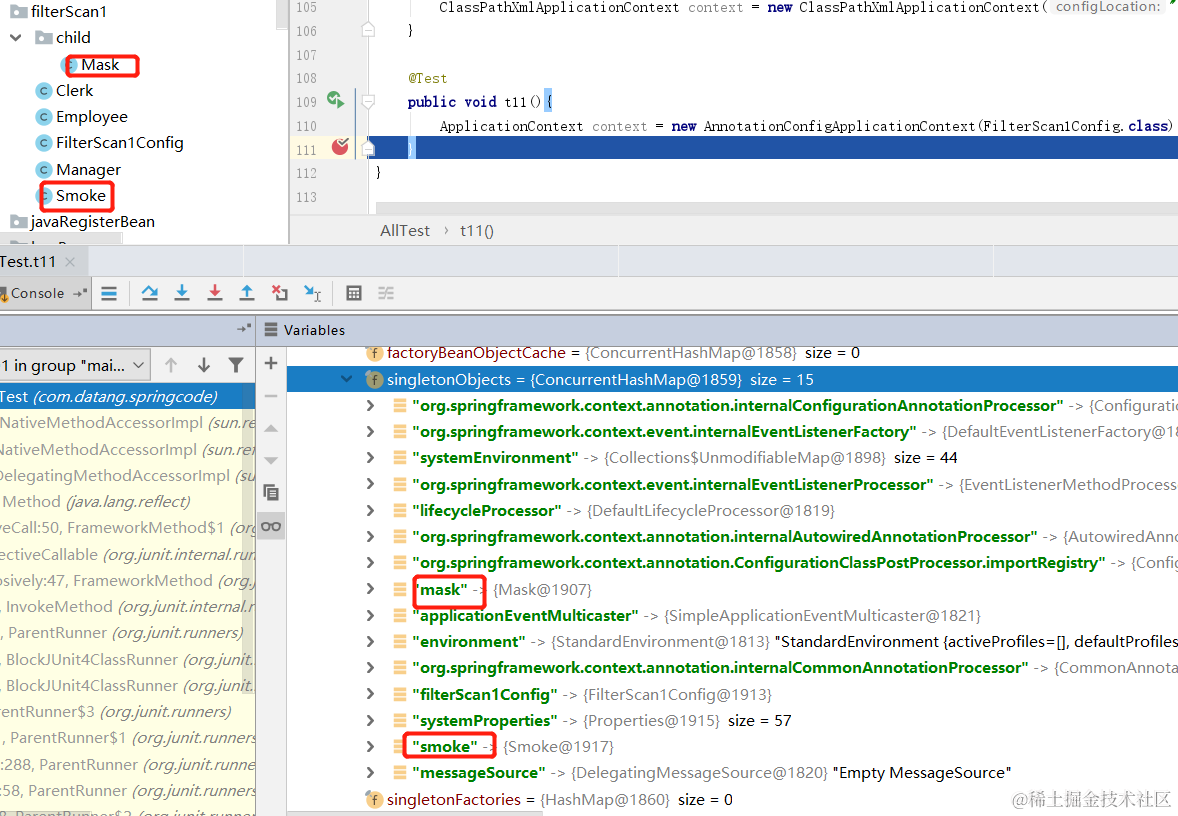 在上边代码中,使用@ComponentScan和@ImportResource注解分别扫描包中的注解和加载xml,为的就是我们能在一个Map中看到三个bean。xml方式实例化bean默认的id是类的全路径拼接#和编号。而@Component注解方式则是使用类名,首字母换成了小写。使用@Bean方式实例化bean时,bean的名称是@Bean所注释的方法名。
