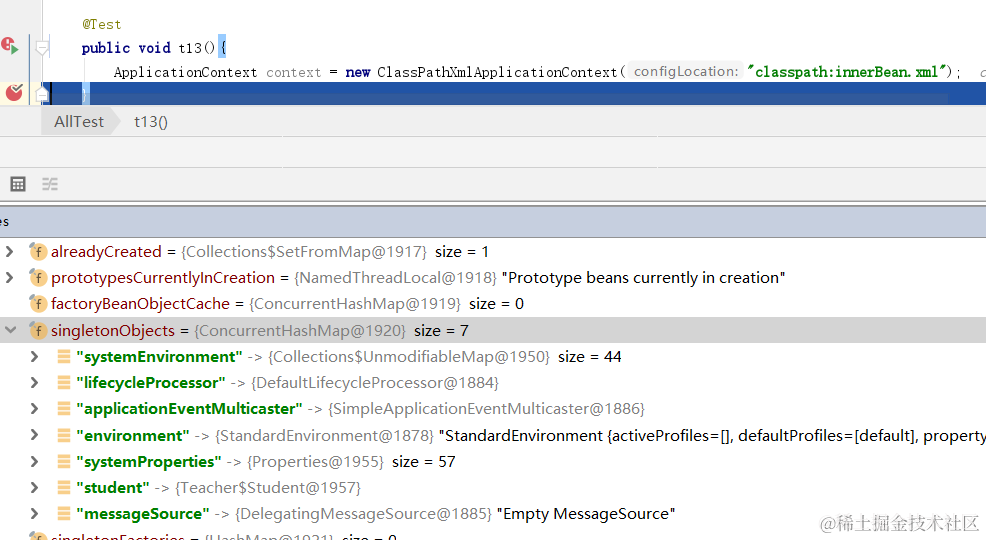 上边介绍的三种方式无论哪一种最终都会将pojo实例化到spring容器中。那么我们经常说的spring容器到底是什么?通过debug查看ApplicationContext对象。在spring上下文中有一个beanFactory对象,该对象实现类DefaultListableBeanFactory。依次再找父类AbstractAutowireCapableBeanFactory-->AbstractBeanFactory-->FactoryBeanRegistrySupport-->DefaultSingletonBeanRegistry中有一个Map,registeredSingletons这个Map就是用来