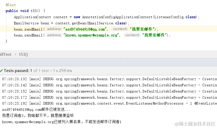 这里讲一下业务逻辑,当我们调用EmailService的sendEmail()方法时会先判断传入的邮件地址是否在黑名单中,黑名单在创建EmailService这个bean时初始化了。如果邮件地址在黑名单中,就new一个BlackListEvent对象,并且传入相关的参数。而BlackListNotifier BlackListNotifier2 两个类都监听的有BlackListEvent所以这时就会执行相应的方法。这里我们需要说下,使用@EventListener注解的方法,可以监听多个事件类。另外这些监听类都是同步执行的,一个执行完毕另一个才会后续执行。多个被@EventListener注释的方法可以用 @Order()指定顺序