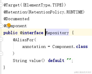 //这个注解才是真正的java实例化bean的关键,可以指定多个value值,第一个往后,为别名