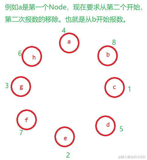 约瑟夫环又称丢手绢是一个非常有名的数学问题,它规定一个环形链表中从N的位置开始第M个Node被删除,直到元素内没有元素,算出它们的删除顺序。