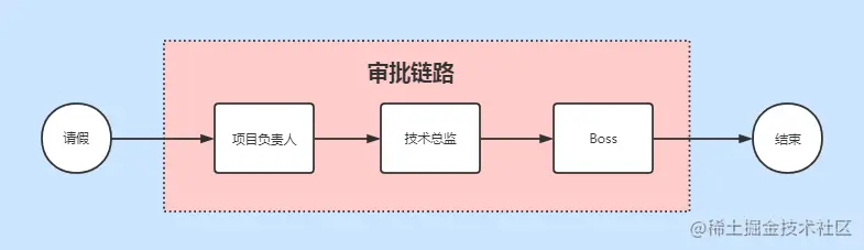 其实,我们生活中也有着非常多的责任链模式。比如:基本上每个公司都有自己的OA系统,主要是员工基本信息、请假、调休、报销等功能。如果,我有事需要请假两天,于是登录OA系统,发起请假审批。