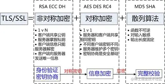 HTTPS协议的主要功能基本都依赖于TLS/SSL协议,TLS/SSL的功能实现主要依赖于三类基本算法:散列函数 Hash、对称加密和非对称加密,其利用非对称加密实现身份认证和密钥协商,对称加密算法采用协商的密钥对数据加密,基于散列函数验证信息的完整性。
