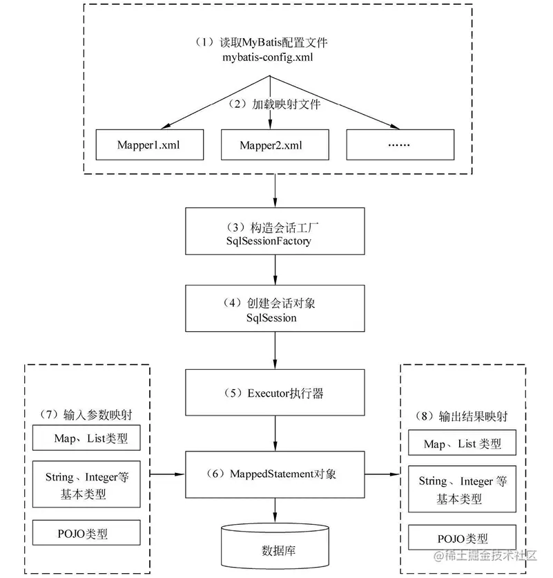 - 输出结果映射:输出结果类型可以是 Map、 List 等集合类型,也可以是基本数据类型和 POJO 类型。输出结果映射过程类似于 JDBC 对结果集的解析过程。