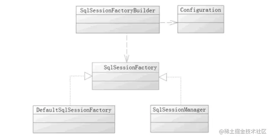 SqlSessionFactory 是一个接口,在 MyBatis 中它存在两个实现类:SqlSessionManager 和 DefaultSqlSessionFactory。一般而言,具体是由 DefaultSqlSessionFactory 去实现的,而 SqlSessionManager 使用在多线程的环境中,它的具体实现依靠 DefaultSqlSessionFactory,它们之间的关系如图所示。