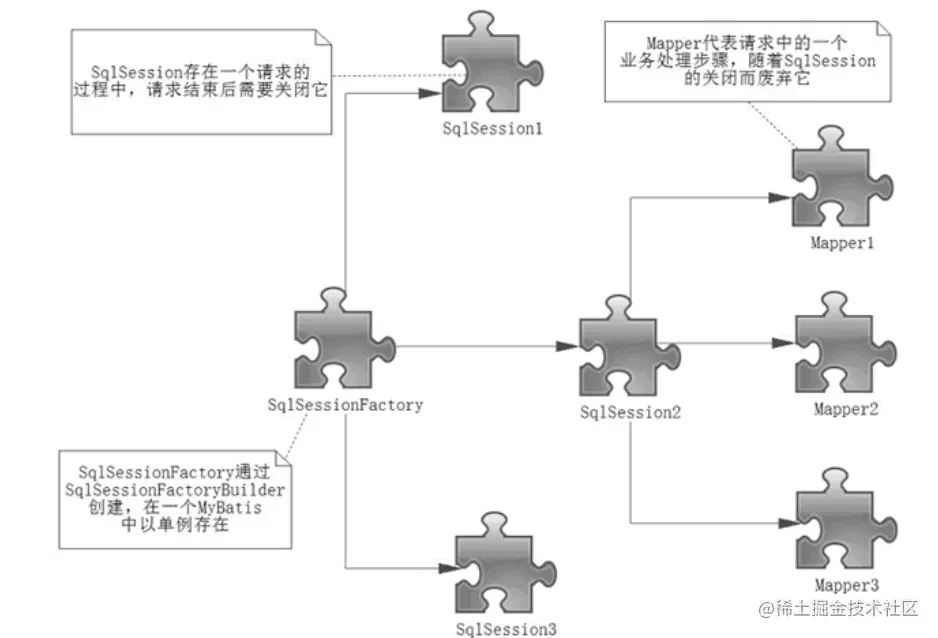 Mapper 是一个接口,它由 SqlSession 所创建,所以它的最大生命周期至多和 SqlSession 保持一致,尽管它很好用,但是由于 SqlSession 的关闭,它的数据库连接资源也会消失,所以它的生命周期应该小于等于 SqlSession 的生命周期。Mapper 代表的是一个请求中的业务处理,所以它应该在一个请求中,一旦处理完了相关的业务,就应该废弃它。