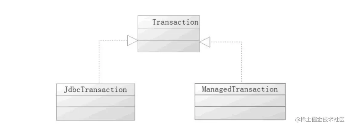 于是它对应着两种工厂:JdbcTransactionFactory 和 ManagedTransactionFactory,这个工厂需要实现 TransactionFactory 接口,通过它们会生成对应的 Transaction 对象。于是可以把事务管理器配置成为以下两种方式: