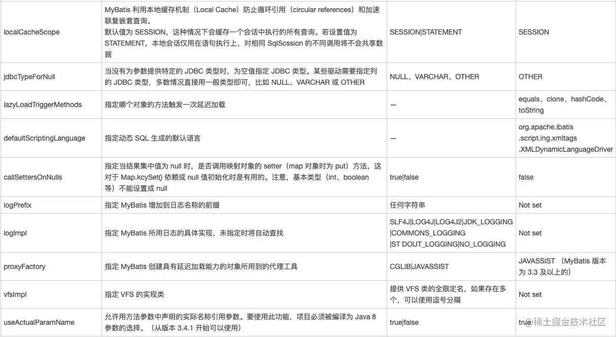 settings 的配置项很多,但是真正用到的不会太多,我们把常用的配置项研究清楚就可以了,比如关于缓存的 cacheEnabled,关于级联的 lazyLoadingEnabled 和 aggressiveLazy Loading,关于自动映射的 autoMappingBehavior 和 mapUnderscoreToCamelCase,关于执行器类型的 defaultExecutorType 等。