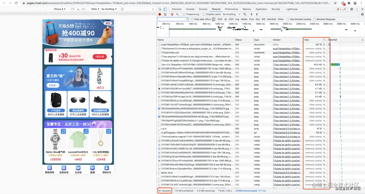 91 requests,113 kB transferred, 2.2 MB resources,Finish: 2.93 s,DOMContentLoaded: 177 ms. 2.2M的资源,达到秒开。看看Size那一列,你就应该好像领悟到什么了。