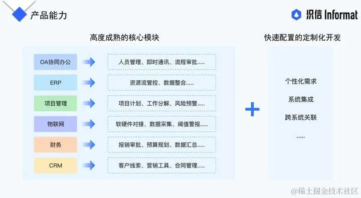 低代码产品目前通过不断的客户交付,提炼出高度成熟的核心模板,就像OA办公里面涉及人员管理、流程审批,ERP里面对于资源管控,数据整合,项目管理等等。这些都是低代码可以提供已经成熟的模块的, 那么真正需要交付的,是右边的这些内容(如下图),低代码基于客户的个性化需求,给客户进行专门的配置,并且完成和原有系统的集成、关联。 帮助企业进行项目的快速落地。