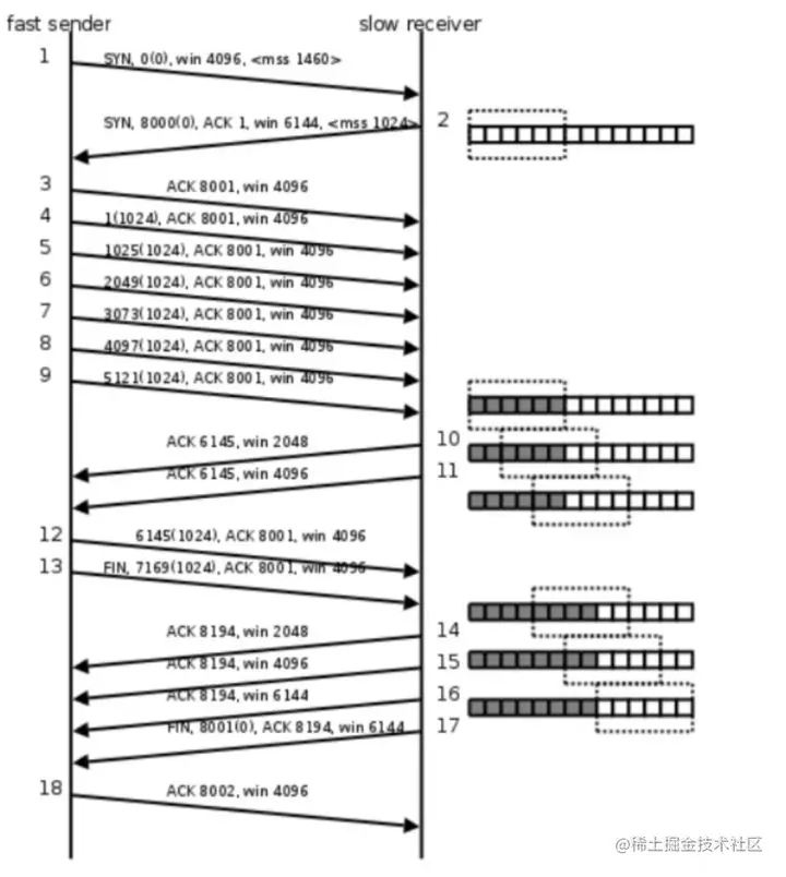 TCP滑动窗口可以看成定义在数据缓冲上的一个窗口。下图是简化的滑动窗口调节示意图,显示了TCP算法通过网络发送小数据包,以及TCP滑动窗口如何控制无需确认即可传输多少数据。随着数据包的延迟,TCP会以较小的窗口大小减慢传输速率,从而进一步限制了允许的未确认数据包的数量。