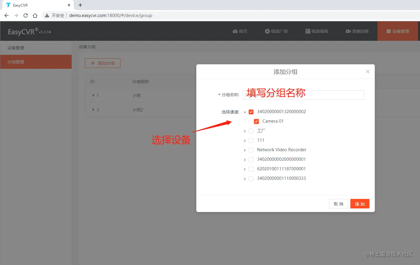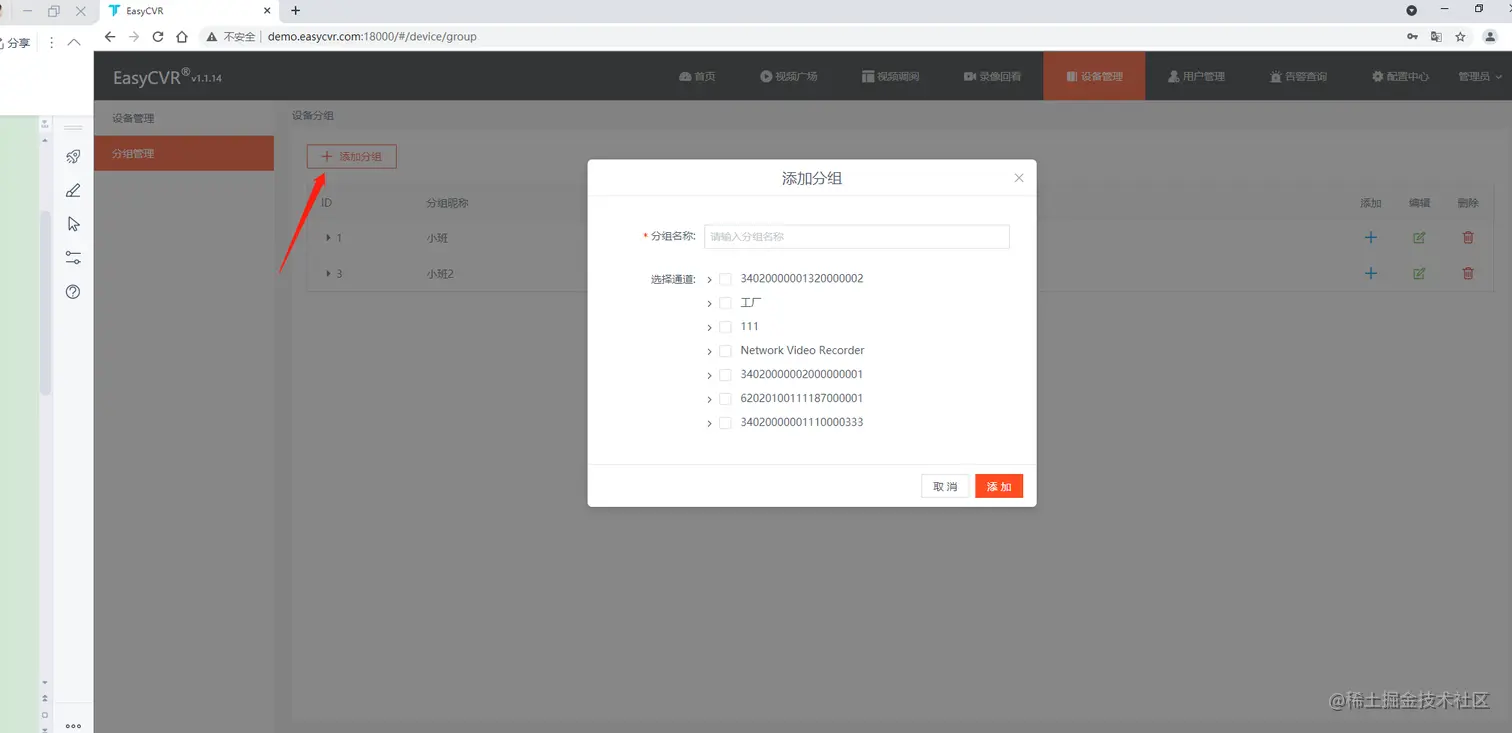在此处填写分组名称并且给该分组添加摄像设备。