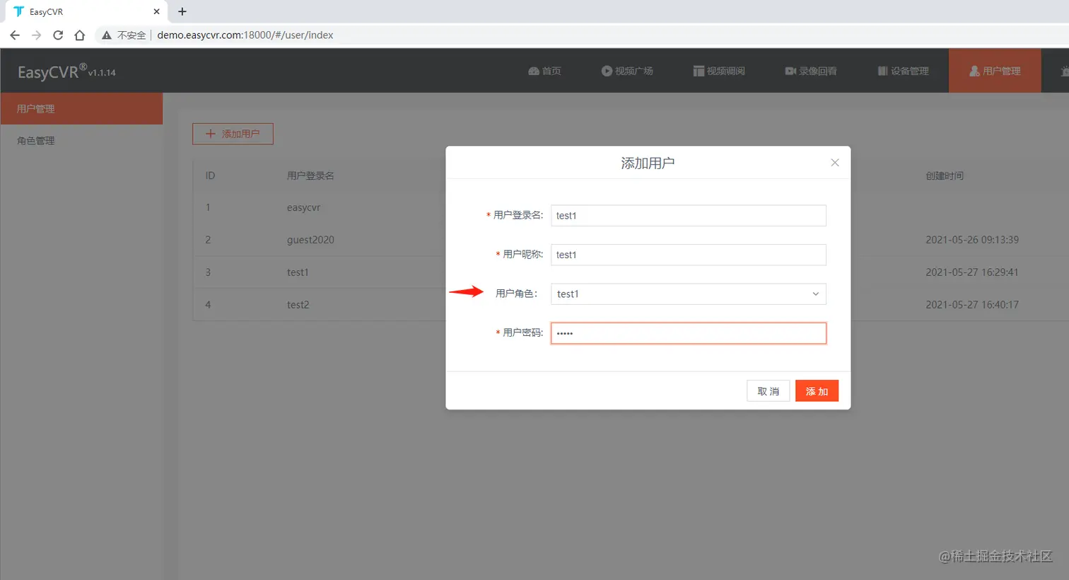 然后,在用户管理的页面创建角色,此处我们拿test1的角色来举例。接下来就需要将角色绑定到用户,打开用户管理并且选择添加用户,这里会打开一个新的窗口: