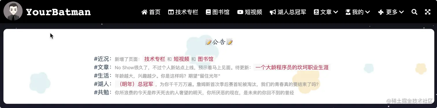 公告栏:实时更新,公示站长(YourBatman)or站点的方方面面近况,如下图所示: