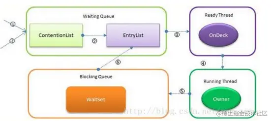 4. OnDeck 线程获取到锁资源后会变为 Owner 线程,而没有得到锁资源的仍然停留在 EntryList中。如果 Owner 线程被 wait 方法阻塞,则转移到 WaitSet 队列中,直到某个时刻通过 notify或者 notifyAll 唤醒,会重新进去 EntryList 中。