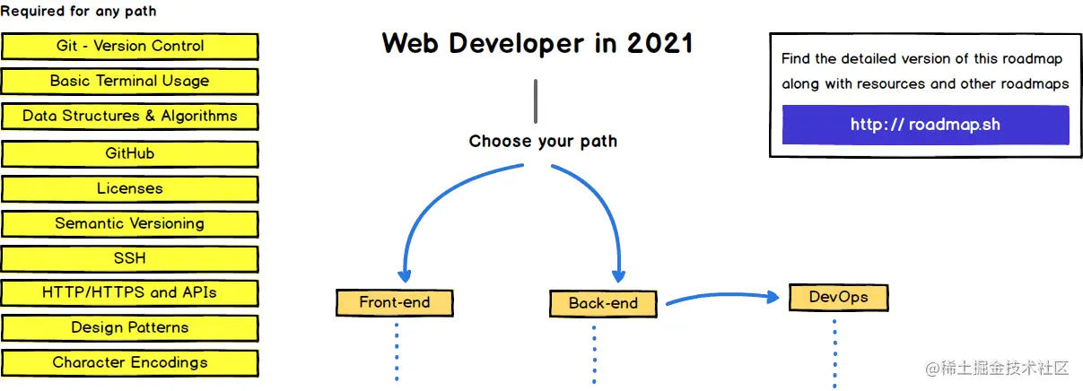 该项目是目前 GitHub 上技术路线(roadmap)关注度最高的开源项目,它涵盖了 Web 开发相关的前端、后端、运维 3 个方面,并通过线路图直观地表现出来,还翻译成了多种语言其中就有中文版。🤫