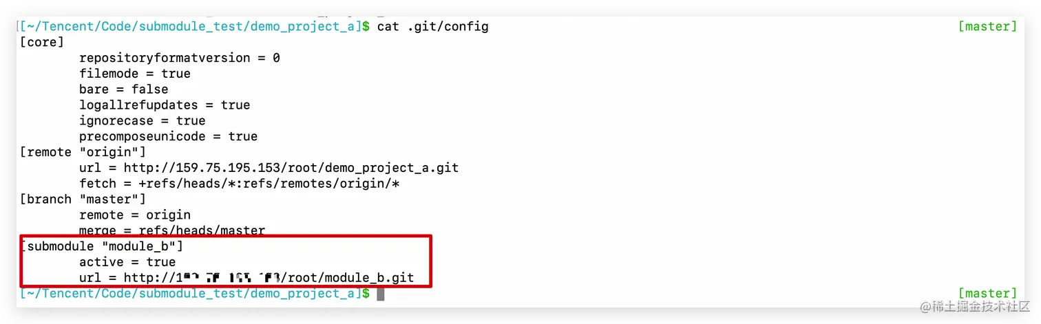 vim .git/config [submodule "module_b"] url = http://xxxxxxx/root/module_b.git -